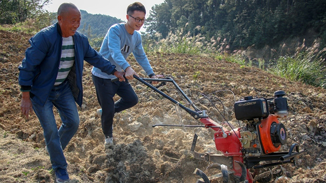 图 员工在老农人指导下学习使用旋耕机