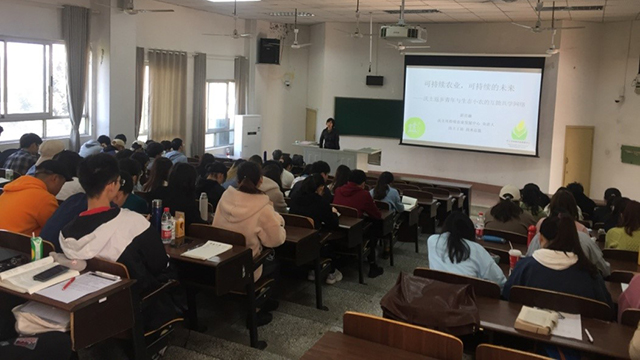 讲座下半场由沃土堆肥农家工作坊讲师、沃土可持续发展中心负责人彭月丽老师主讲。彭老师主要讲解了可持续农业的发展过程经验、生态农业实践的时代背景、生态农业土壤改良的实际案例和城乡互动维持土地肥力的技术要点,并分享了沃土可持续农业的实践经验。她还分享了自己毕业10年来的心路历程,讲述了这些年来生态可持续农业发展的艰苦历程,强调课本知识和实践相结合的必要性,期望同学们珍惜现在的学习机会,把专业知识和实践相结合,给同学们的发展提供了很多有用的建议。