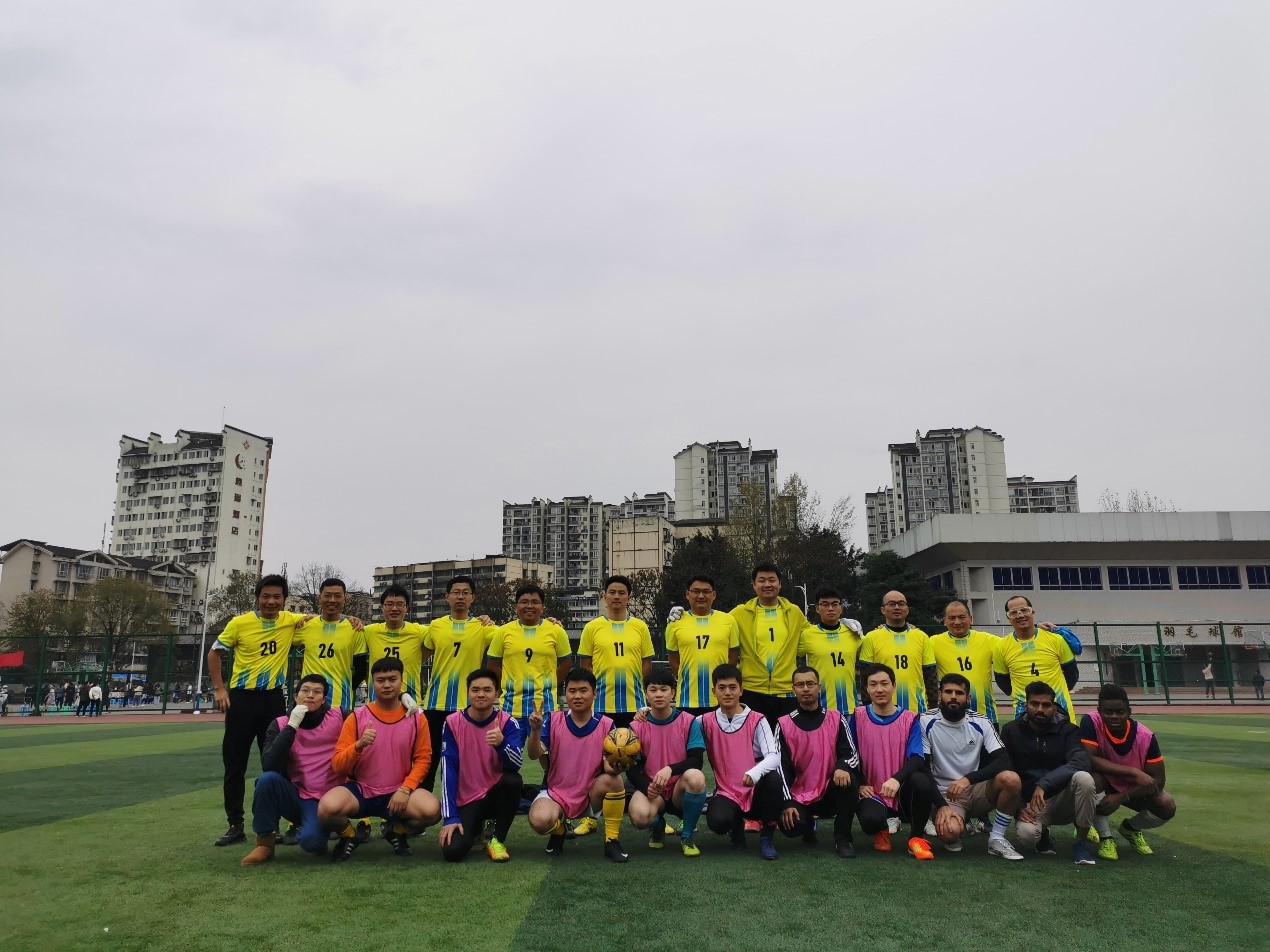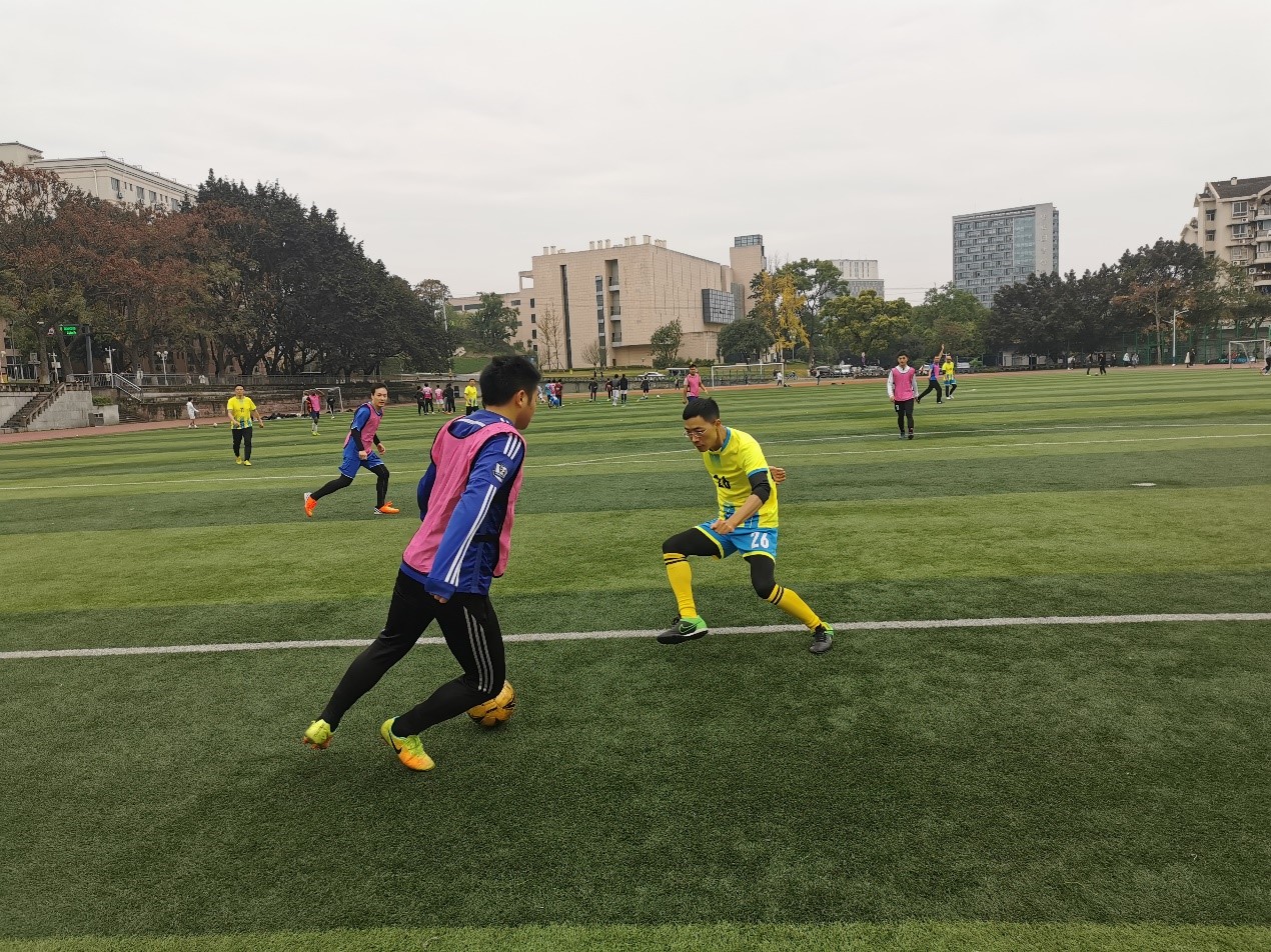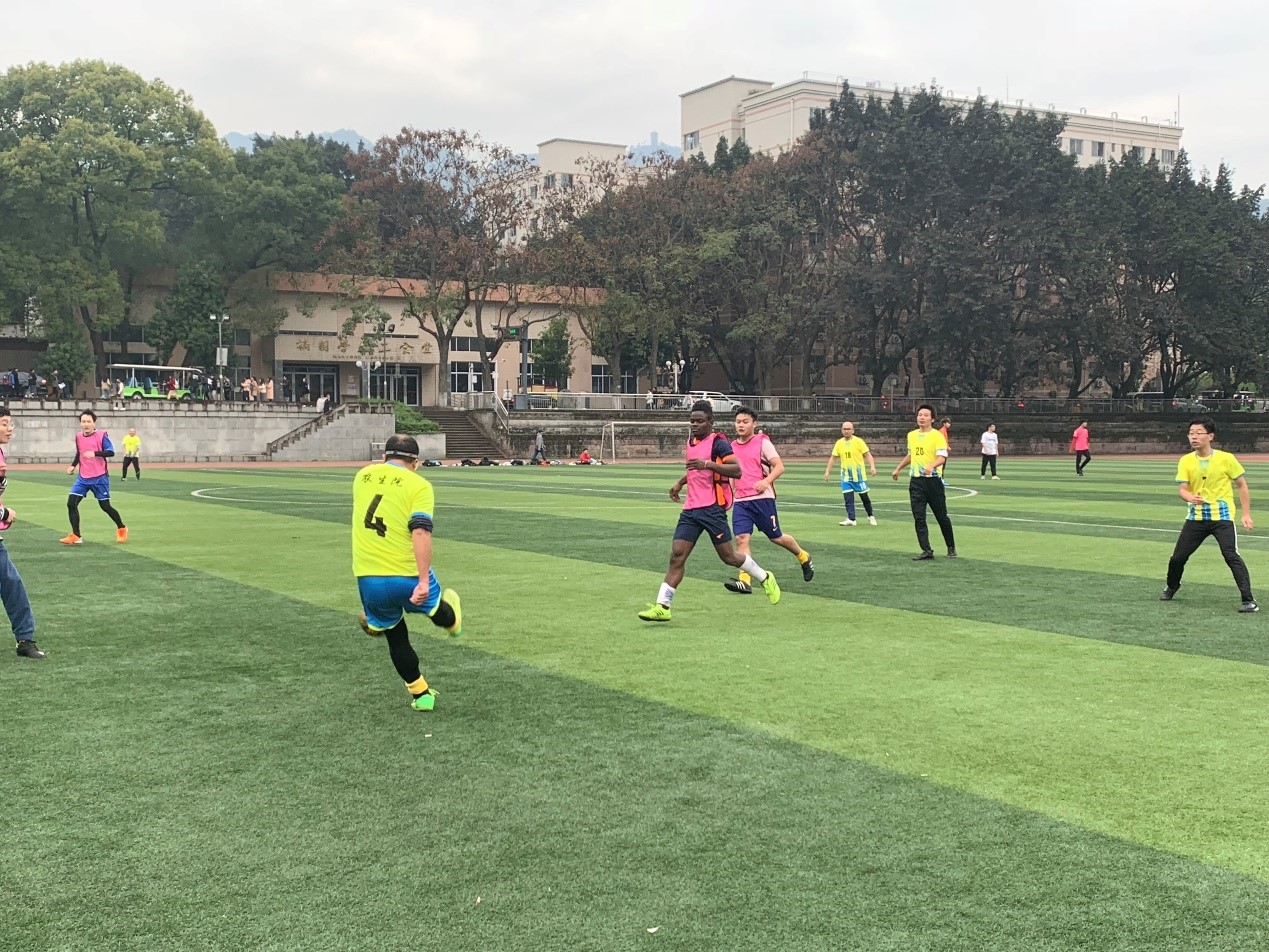 研究生队实力强劲,带球速度快,精力充沛,抢断积极,其中不乏来自非洲和南亚的职工,而老师们以经验和球感见长,跑位准确,脚法精良,配合默契,双方可谓实力均衡。由于教师队大多是七零后和八零后,所以同学们允许老师多次换人,以弥补体能欠缺。场上精彩不断,比分交替上升。中场休息时教工队以1比3落后,下半场重整旗鼓,聚力再战,借助于犀利的进攻结合密集的防守,最终教工队以7比4结束全场比赛。