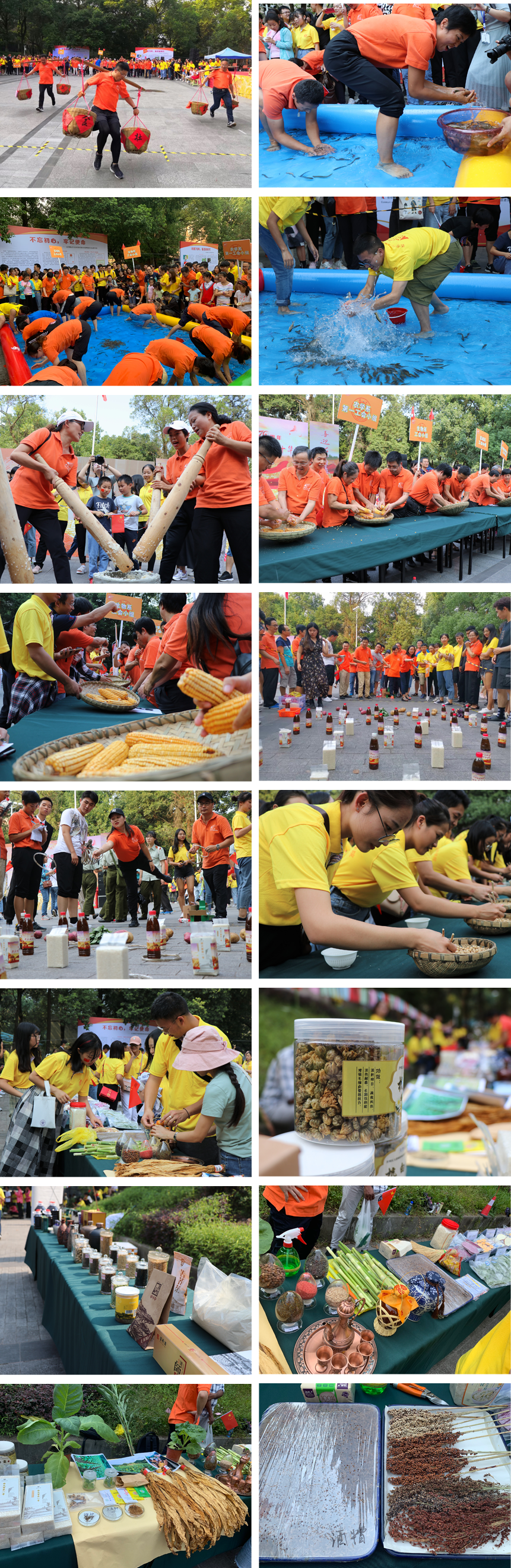 开幕式结束后,举行了农事民俗体验活动和农事竞赛活动,千人打糍粑、“颗粒归仓”挑担子、“浑水摸鱼”捉泥鳅、金玉满堂“剥玉米”、“金珠盈盘”夹黄豆、“硕果累累”套圈圈、游园活动猜谜语等丰富多彩的活动,充分表达丰收的喜悦。平日里严肃庄严、满腹诗书的老师,拥入装满泥鳅的水池,阳光下一次质朴且欢愉的比赛,与池鱼共欢,浪花激荡,哨声逼人,丰收之景,人鱼共欢,场面其乐融融。活动现场还设有农业展览专区,包括“食”和年丰收食品展区和“大有可为”高科技农产品展区,公司各作物课题组提供了高油酸菜油、新品种大米、高粱酒等最新的科研成果、新型品种和转化生产的农副产品,展示公司农业科学研究的丰收成果。