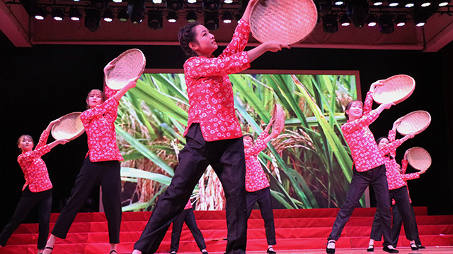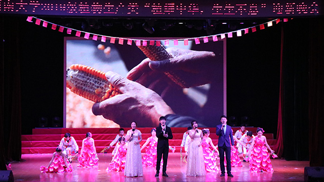 晚会第二篇章“农业梦 守正创新出彩梦”由舞台剧《我们的一天》展开,庄严肃穆的合唱配上妙趣横生的演绎是别样的诙谐,博得全场阵阵掌声。农生院勤劳的姑娘们表演的舞蹈《晒谷子的姑娘们》为观众带来优美地视觉体验。晒谷子,是中国传统农耕文明中重要的一环,晒谷姑娘们一个个朝气蓬勃,脸上洋溢的是丰收的幸福,那一抹浅笑是丰收时秋天的味道;那一支稻穗是对农人衷心的祝福。影子戏《一生甘为一粒种》为我们生动地演绎了袁隆平学长无私奉献、无悔付出的一生;舞台剧《绿色梦想》展示了在梦想的路上的坚定与果敢;由师生共同演绎的诗朗诵《守正创新农业人》再一次升华了一代又一代农科人在研究的路上忠诚报国、一心向党。