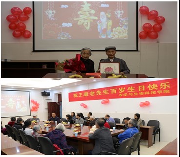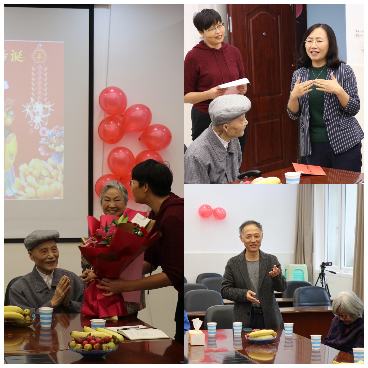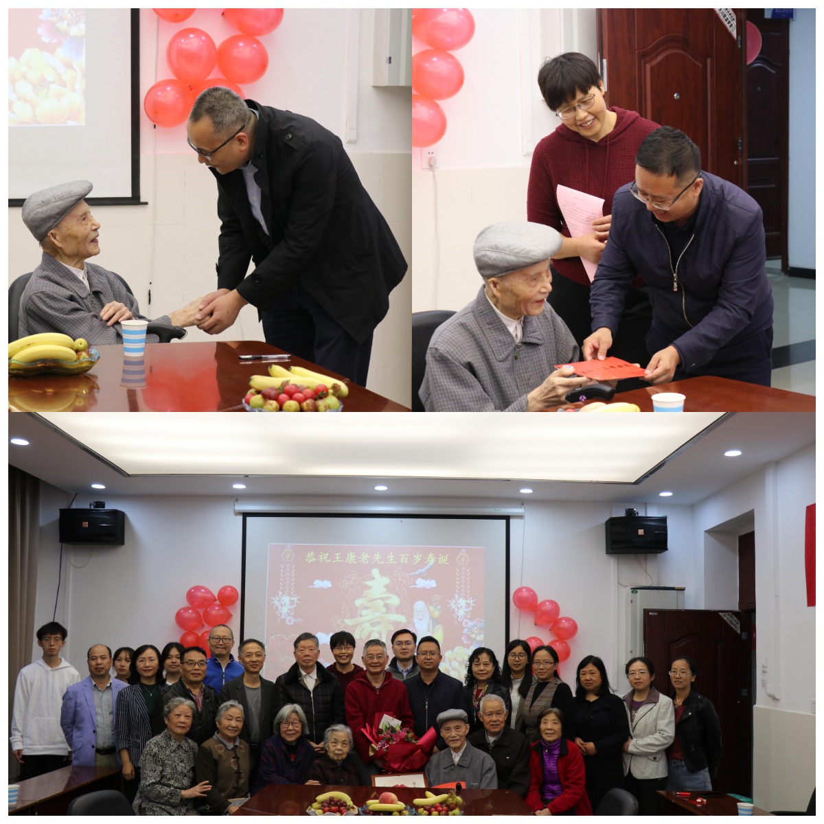 公司退休教师王康老先生迎来了他的百岁寿辰,依照重庆习俗,公司为老先生策划了这场别开生面的百岁寿辰茶话会。学院领导及在职、退休教师代表和王康老师的好友同事们参加了茶话会,共同祝福王康老师生日快乐,福寿安康!院老协小组长孙泽江老师献上鲜花及祝福,教研组同事吴珍龄老师献上自己创作的“双寿”图表示祝贺。王三根老师作为王康老师的员工代表向大家讲述了老先生在教育科研工作上无私奉献、与时俱进,敢为人先的精神。