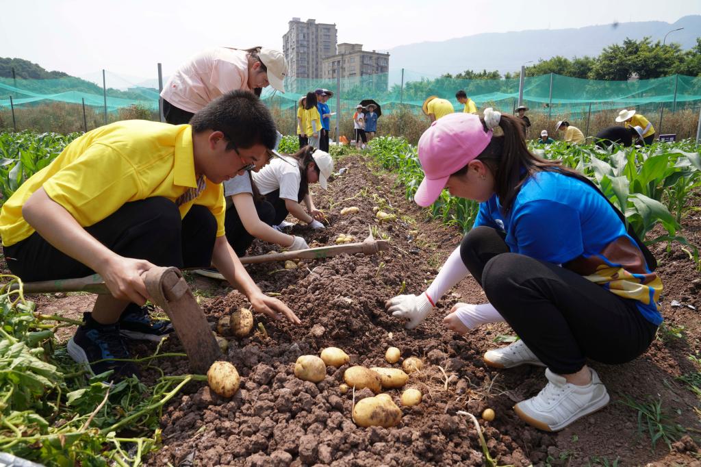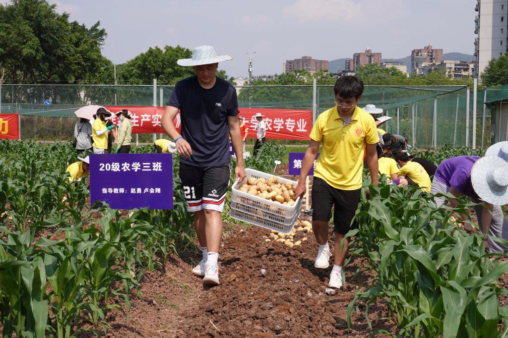 文公司2020级汉语言文学专业的李雅舒同学也深有感触:“作为一个文科生,像这样的亲身下田实践、亲近大自然的机会是很少,通过这次活动我们亲身印证了‘汗滴禾下土’的感觉,体会到了农民的辛苦,真是一种与往常不一样的学习!”此外,蚕桑纺织与生物质科学公司的同学还捡拾了一筐割除的马铃薯茎叶带回去喂养的自己科研实验研究的茄二十八星瓢虫,将作物资源有效利用。