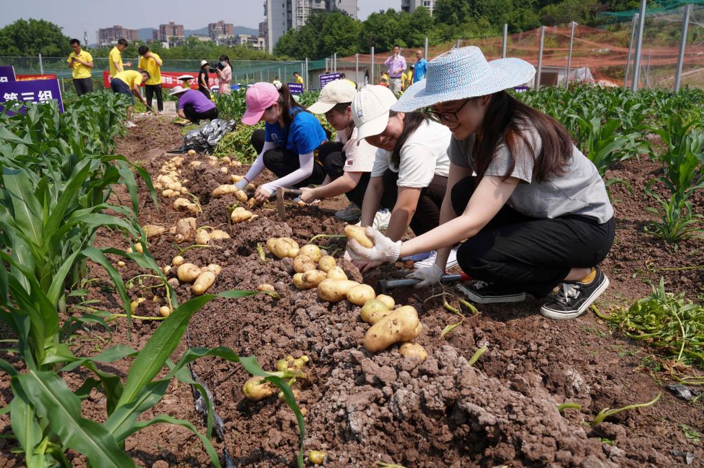 5月7日下午2点至6点,72名体验者分批次跟随农学专业员工来到试验田里,认真聆听课程任课教师赵勇对马铃薯收获测产整个流程的介绍,并观摩了现场示范后,开始实践操作。烈日下,热浪在田间翻滚,同样翻滚着的还有同学高昂的热情。割茎叶、回收薄膜、统计种植密度、收挖、薯块分级、测产量,来自各院的同学深度参与其中,撸起袖子在田地间辛勤劳作,挥洒汗水,在劳动中感受丰收的喜悦,也体会农业生产的艰辛。
