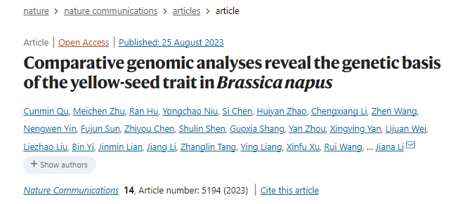 2023年8月25日,bevictor1946韦德官网油菜分子生物学研究团队李加纳教授/曲存民教授在Nature Communications发表了题为Comparative genomic analyses reveal the genetic basis of the yellow-seed trait in Brassica napus的研究论文,该研究通过甘蓝型油菜黄籽GH06和黑籽中油821高质量基因组的组装,围绕控制种皮色泽主效QTL区间,成功克隆了一个控制油菜种皮色泽重要基因,并解析了其参与调控种皮色泽形成和类黄酮代谢的分子机制,为油菜品质性状改良提供了新的分子策略。