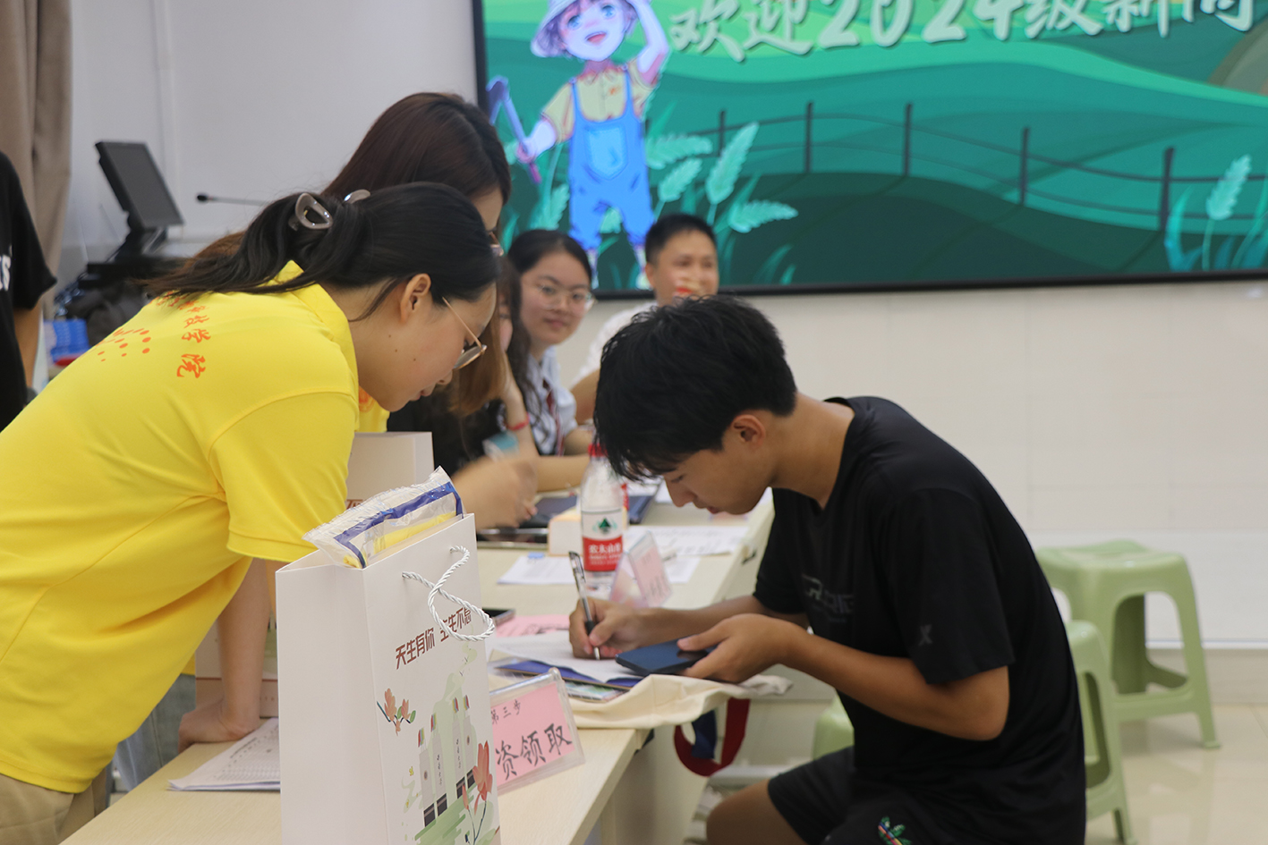 9月7、8号,2024级本科新生在学长学姐的指引下,来到37教207会议室办理报到手续。教室内,清冽的茶水饮料,耐心的学长学姐,让新同学们充分感受到公司的温暖。同学们在展板前拍照留念,用镜头定格下他们阳光般灿烂的笑容。
