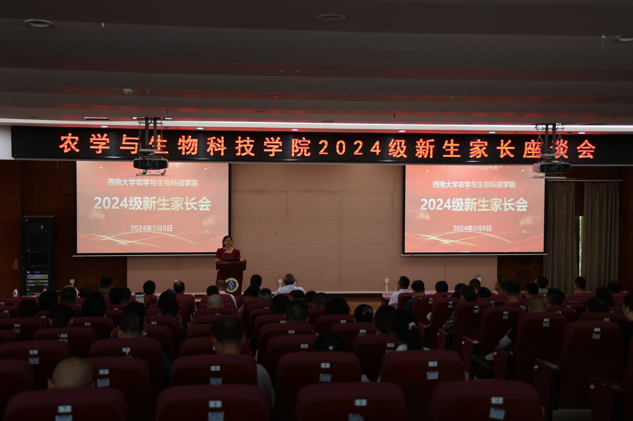 9月8日15点,bevictor1946韦德官网2024级新生家长座谈会在隆平楼204报告厅隆重举行。公司党委书记阳义健、经理吕典秋、党委副书记郑莉佳,副经理张建奎、各系主任、教学办公室主任、2024级辅导员及各班班主任出席了见面会,会议由党委副书记郑莉佳主持。在《我有一个梦》的优美旋律中,新生家长们陆续步入会场。党委副书记郑莉佳向新生家长逐一介绍出席座谈会的领导嘉宾并代表公司向家长们的到来表示热烈的欢迎。经理吕典秋从公司的办学历程、团队队伍、学术科研、人才培养、毕业生就业情况等方面,向新生家长们做了全面而详细的介绍。辅导员王皓老师就员工住宿、公司生活、员工可能遇到的机遇与挑战、家长遇到的常见问题等方面进行了指导,希望家长可以做好员工坚强的后盾,做到倾听、理解、支持、信任。同时也针对员工学业管理、安全教育等重要事项进行了沟通与说明。会议最后,公司党委书记阳义健讲话,希望大一新生入学后,珍惜宝贵时光,积极面对生活环境、人际环境、经济环境和学习环境的变化,向公司的研究生党员标兵、创新创业大赛金奖获得者等优秀学长学姐看齐。同时,他表达了对家长信任的真切感谢,希望未来加强家校协同育人机制,共同培养“德智体美劳”全面发展的新农人。