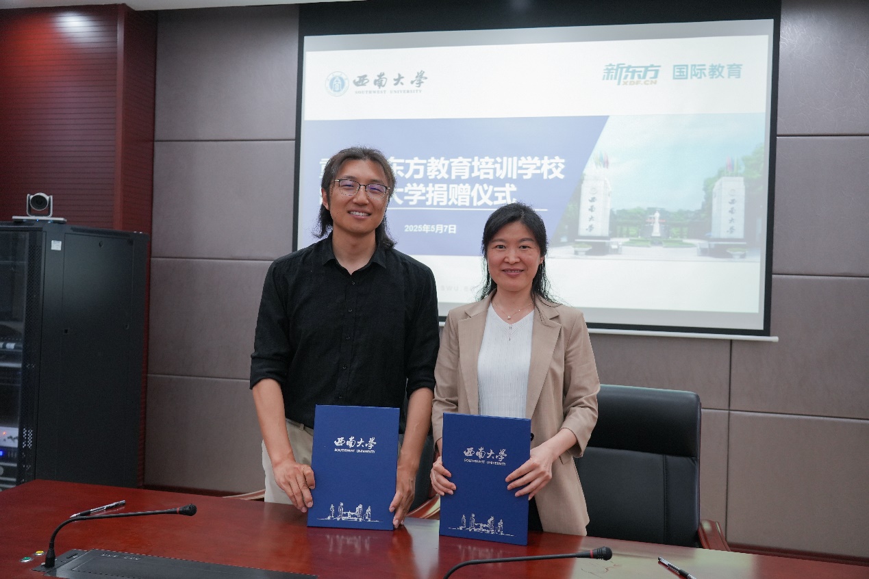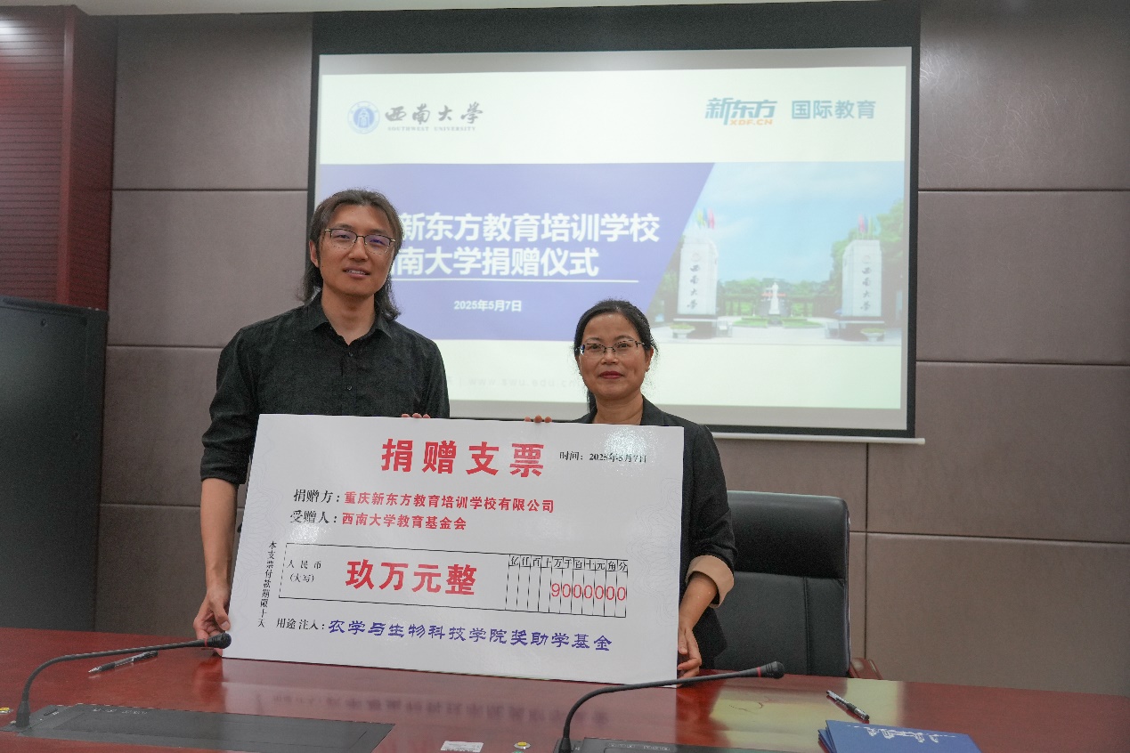 为支持农生学子赴海外深造,重庆新东方教育培训公司有限公司向公司捐赠九万元设立“国际教育奖助学金”。5月7日上午,捐赠仪式在隆平楼108会议室举行。重庆新东方教育培训公司有限公司总经理杨笑天一行,公司对外联络办公室副主任陈建英,公司党委书记阳义健、纪委书记郑莉佳、副书记刘秋艳等师生代表参加签约仪式。仪式由刘秋艳副书记主持。
