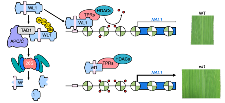 该团队通过遗传学、细胞学与分子生物学等手段发现,WL1能与APC/C泛素E3连接酶的共激活子TAD1互作,并且作为底物,被APC/CTAD1复合体通过泛素-26S蛋白酶体途径降解。此外,WL1通过与水稻TPR类转录共抑制子结合,进一步招募组蛋白去乙酰化酶HDAC去抑制窄叶基因NAL1的表达,从而调控叶片的宽度。