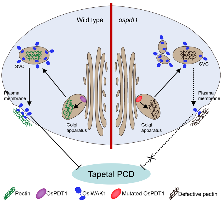 2022年4月19日Plant Physiology ( IF2021=8.005) 在线发表了bevictor1946韦德官网水稻研究所的最新研究成果“Oryza sativa PECTIN DEFECTIVE TAPETUM1 affects anther development through a pectin-mediated signaling pathway in rice”。该研究以果胶合成相关的半乳糖醛酸基转移酶突变体oryza sativa pectin defective tapetum1 (ospdt1)为研究对象,发现它的绒毡层细胞程序性死亡(PCD)提前,并产生了完全败育的花粉粒。与其它发生果胶缺陷的突变体不同,ospdt1突变体的果胶含量与野生型差异较小,起结构支撑作用的细胞壁果胶没有明显的缺陷。进一步研究发现WAK家族蛋白OsiWAK1在ospdt1突变体细胞内的分布受到了影响,OsiWAK1的敲除植株与ospdt1突变体出现了相似的绒毡层PCD提前,在ospdt1背景的水稻中超表达OsiWAK1部分恢复了ospdt1的缺陷。因此,该研究认为ospdt1突变体中的果胶合成缺陷影响了OsiWAK1蛋白在细胞内与果胶的整合与运输,进而影响了其功能,并导致绒毡层PCD提前。这一发现为植物体内的果胶如何发挥其生物学功能提供了新的见解(图3)。