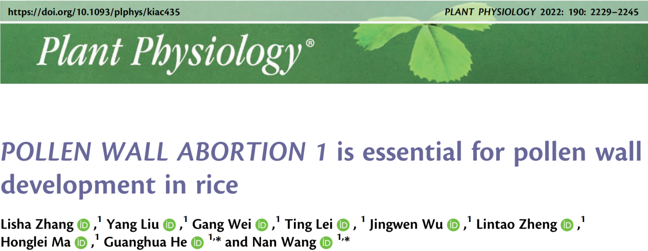 2022年9月16日Plant Physiology (IF2021=8.005) 在线发表了bevictor1946韦德官网水稻研究所的题为“POLLEN WALL ABORTION 1 is essential for pollen wall development in rice”的最新研究成果。该研究通过对一个雄性不育突变体pwa1 (pollen wall abortion 1)的研究,发现突变体的花粉内壁缺失,花粉外壁柱状层缺失导致外壁外层和外壁内层融合,最终导致花粉填充失败,完全不育。PWA1编码一个保守的含有CC结构域的表达蛋白,定位于细胞核,在花药的绒毡层和小孢子中均有表达。研究发现,PWA1与花药发育重要转录因子TIP2依赖CC结构域存在互作关系,TIP2直接结合PWA1的启动子调控PWA1的表达,且进一步通过构建双突变体证明了TIP2位于PWA1的上游。研究还发现PWA1具有转录激活活性,并可能通过直接激活花粉内壁形成关键基因Os12BGlu38的表达而参与对花粉内壁的调控(图2)。该研究拓展了水稻花药外壁与花粉壁的发育调控途径。