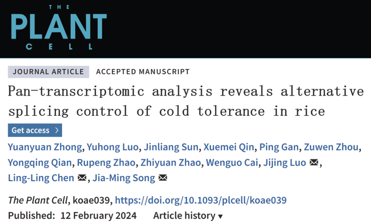 2024年2月12日,bevictor1946韦德官网宋佳明研究员和广西大学陈玲玲、罗继景教授团队在国际著名植物学术期刊The Plant Cell在线发表了题为Pan-transcriptomic analysis reveals alternative splicing control of cold tolerance in rice的研究论文,以水稻为模式,构建了泛转录组表征作物响应冷胁迫的转录调控景观,揭示剪切因子的驯化选择参与作物的生态适应性演化。