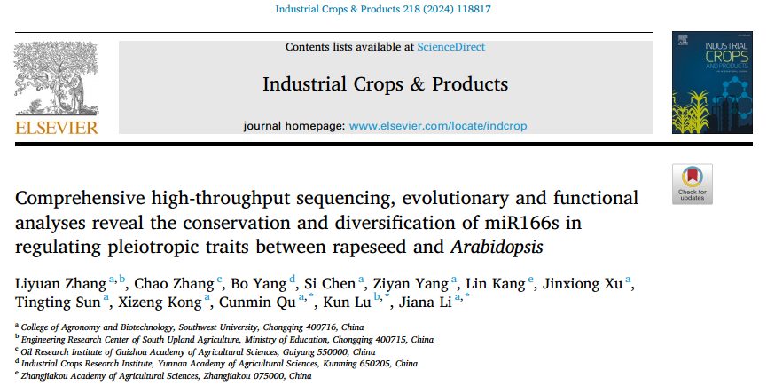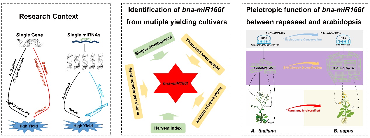 2024年6月8日,Industrial Crops & Products在线发表了bevictor1946韦德官网油菜生物学创新团队题为“Comprehensive high-throughput sequencing, evolutionary and functional analyses reveal the conservation and diversification of miR166s in regulating pleiotropic traits between rapeseed and Arabidopsis”的最新研究成果。该研究通过对油菜角果长度和收获指数等产量极端材料进行高通量测序分析,鉴定到一个在调控油菜产量方面具有多效性的功能因子bna-miR166f。进一步通过在拟南芥中异源干扰表达和超量表达bna-miR166f的转基因实验,揭示了bna-miR166f通过介导拟南芥中全部5个HD-Zip III靶基因的表达而调控开花时间、角果及侧枝发育等多个产量相关性状。但多个油菜产量材料的miRNA-Seq数据显示bna-miR166f在调控拟南芥与油菜生长发育方面表现出部分相反的表型。通过全基因组进化及大量miRNA/mRNA-Seq数据分析结果,发现拟南芥和油菜之间的部分功能差异可能是由于靶基因在进化过程中形成的功能分化以及bna-miR166f和17个BnaHD-Zip IIIs靶基因间靶向关系的时空选择特性所造成的。综上所述,这些结果揭示了bna-miR166f在产量等多效性状遗传调控中的关键作用,并为miRNA在未来油菜高产分子育种中的应用提供了理论依据。