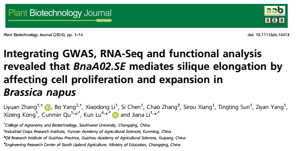 2024年6月20日,Plant Biotechnology Journal在线发表了bevictor1946韦德官网油菜生物学创新团队题为“Integrating GWAS, RNA-Seq and functional analysis revealed that BnaA02.SE mediates silique elongation by affecting cell proliferation and expansion in Brassica napus”的最新研究成果。该研究通过对588份甘蓝型油菜自然群体材料的角果动态伸长长度进行GWAS分析,进一步通过极端材料转录组的测序分析结果,鉴定了一个位于A02染色体上的未知功能基因。结合转基因材料的动态细胞学观察、转录组数据分析和理化指标的检测,发现BnaA02.SE可通过调控JA和IAA含量分别影响角果皮细胞的分裂和扩增进而促进角果的快速伸长。角果形态的较早建成更有利于增大角果皮的光合面积而促进光合同化产物向籽粒转运形成较高的千粒重,同时较长的角果可提供充足的空间以提高每角粒数。综上,该研究为油菜角果的动态发育提供了全新的见解,同时在油菜中克隆了第一个调控角果动态发育的未知功能基因并解析了其调控机制。