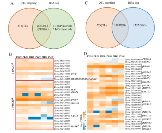 研究人员为进一步鉴定大豆蛋白质含量和含油量相关的稳定QTL,基于作图群体内的蛋白质含量和含油量,构建了蛋白质含量高池和低池。对亲本和两个极端池进行了BSA测序,以获得与蛋白质和油含量相关的差异SNP和InDels,最终分析确定了四个候选区间,其中1号染色体上的候选区间包含qOIL1.2,14号染色体上的区间包含qPRO14.1,表明这两个区域分别为调控含油量和蛋白质含量的稳定QTL。同时对极端池株系受精后20天、30天和40天的种子进行了RNA测序分析,共鉴定出1352个差异表达基因,其中有199个差异表达基因位于QTL区域内。结合EMS诱导突变系和SoyGVD数据库中候选基因的自然变异进行含蛋白质含量和含油量分析,最终筛选出12个候选基因,这些发现为进一步研究候选基因和标记辅助选择( MAS )在大豆育种中提高种子蛋白质和油分含量奠定了基础。
