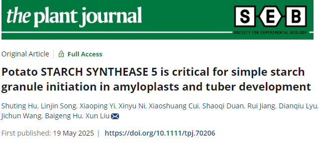 近日,bevictor1946韦德官网薯类团队在植物学TOP期刊The Plant Journal上在线发表了题为“Potato STARCH SYNTHASE 5 is critical for simple starch granule initiation in amyloplasts and tuber development”的研究论文。