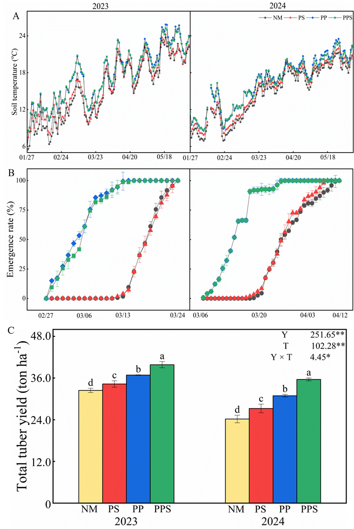 图1 不同覆盖方式下土壤温度(A)、出苗动态(B)及块茎产量(C)表现