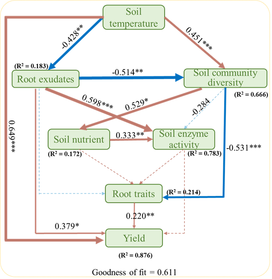 图3 PLS-PM揭示土壤温度变化对根分泌物、土壤群落多样性、土壤养分、酶活性、根部特征以及马铃薯产量的影响