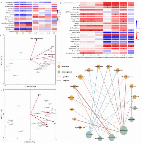 通过设置不覆盖处理(NM)、秸秆覆盖(PS)、地膜覆盖(PP)以及地膜秸秆双覆盖(PPS)四种处理,该研究系统监测了土壤温度、根系形态、根际代谢物、土壤微生物群落及酶活性等指标。结果表明,PPS处理能够早期显著提升土壤温度,促进马铃薯提前出苗;在生长中后期,秸秆的调温保墒作用则缓解了单用地膜可能导致的高温胁迫,维持了根系活力和光合功能。更为重要的是,研究从根际代谢组与微生物组互作的角度揭示了PPS增产的内在机制。PPS处理显著上调了根际中阿拉伯糖酸内酯、苹果酸、富马酸等有益代谢物的分泌,同时富集了Burkholderia与Myxococcota等功能微生物类群。这些代谢物与微生物协同增强了土壤脲酶和蔗糖酶活性,促进了氮、磷、钾等养分的有效化,最终构建了“覆盖–增温–根系发育–代谢物分泌–微生物招募–养分活化–产量提升”的良性互作通路。