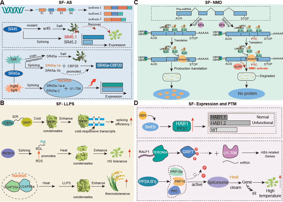 论文详细阐述了AS在高温、低温、干旱及盐胁迫响应中的特异性功能,并分别梳理了其在不同胁迫条件下对植物生物钟与开花过程的调控机制及作用关系。另外,文中还探讨了植物胁迫记忆与AS的关联,以及剪接因子的分类、功能及其介导的抗逆基因调控机制,填补了剪接因子在作物抗逆网络中进行系统性整合的空白。
