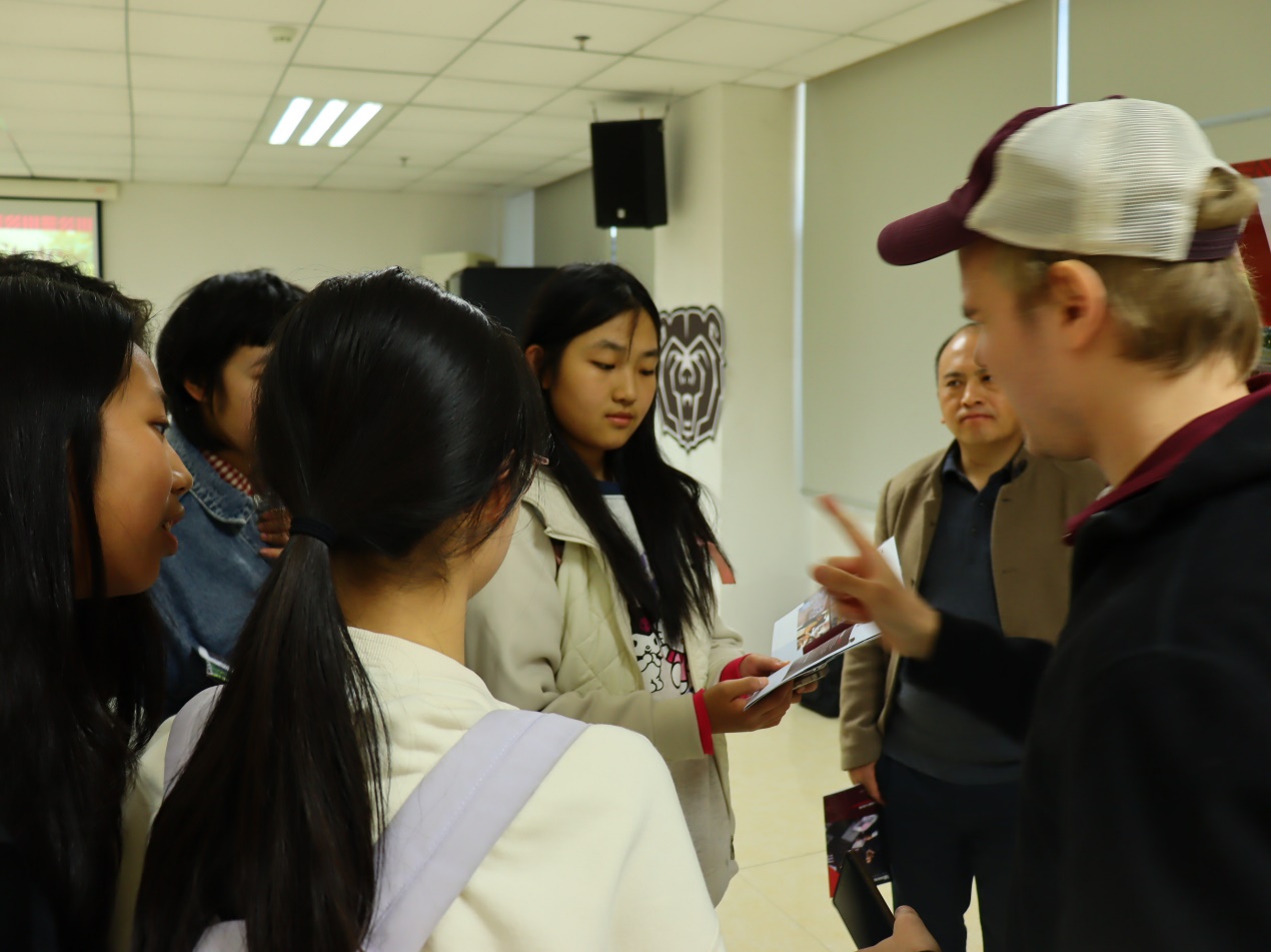 本次活动创新采用“分批入场、面对面精准对接”模式,严格把控交流节奏,确保每位员工都能获得充分的咨询机会,显著提升活动实效。活动精心设置五大核心咨询展区,全面覆盖学子海外求学的核心需求,构建系统化信息服务体系。常驻公司的外籍教师Joshua Conaway负责“MSU生活区”讲解,万华方副教授协助,为低年级员工详细解读MSU生活条件、住宿标准等关键信息;Daniel Baird聚焦“校园实践”板块,围绕国际员工项目(IFP)、员工社团参与及校园安全规范等内容展开分享,通过实景照片直观呈现海外校园多元氛围,2025级班主任阎星颖副教授协助完成双语沟通;John Phillips负责“MSU娱乐活动”介绍,系统讲解校园体育赛事、员工聚会等特色活动,助力学子提前感知海外校园文化底蕴;Daphne Miles针对课程设置、教学设施、实习资源及实地考察项目进行专业解读,为员工学术发展规划提供科学指引;MSU招生宣传官Jinzi Fan通过展示美国德州农工大学、荷兰瓦赫宁根等世界知名院校录取员工案例,分享成功经验,为学子海外升学注入强劲信心。