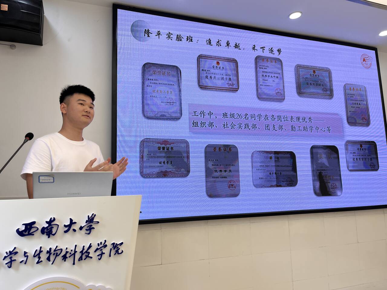 随后,2021级员工罗泽江以《一粒良种,万亩新春》为题,分享了自己在隆平班的成长经历与收获。他讲述了在专业学习、科研实践以及团队协作中的点点滴滴,那些克服困难后的喜悦、取得进步时的自豪,都化作宝贵的经验传递给学弟学妹们,激励大家在隆平班这片沃土上茁壮成长。