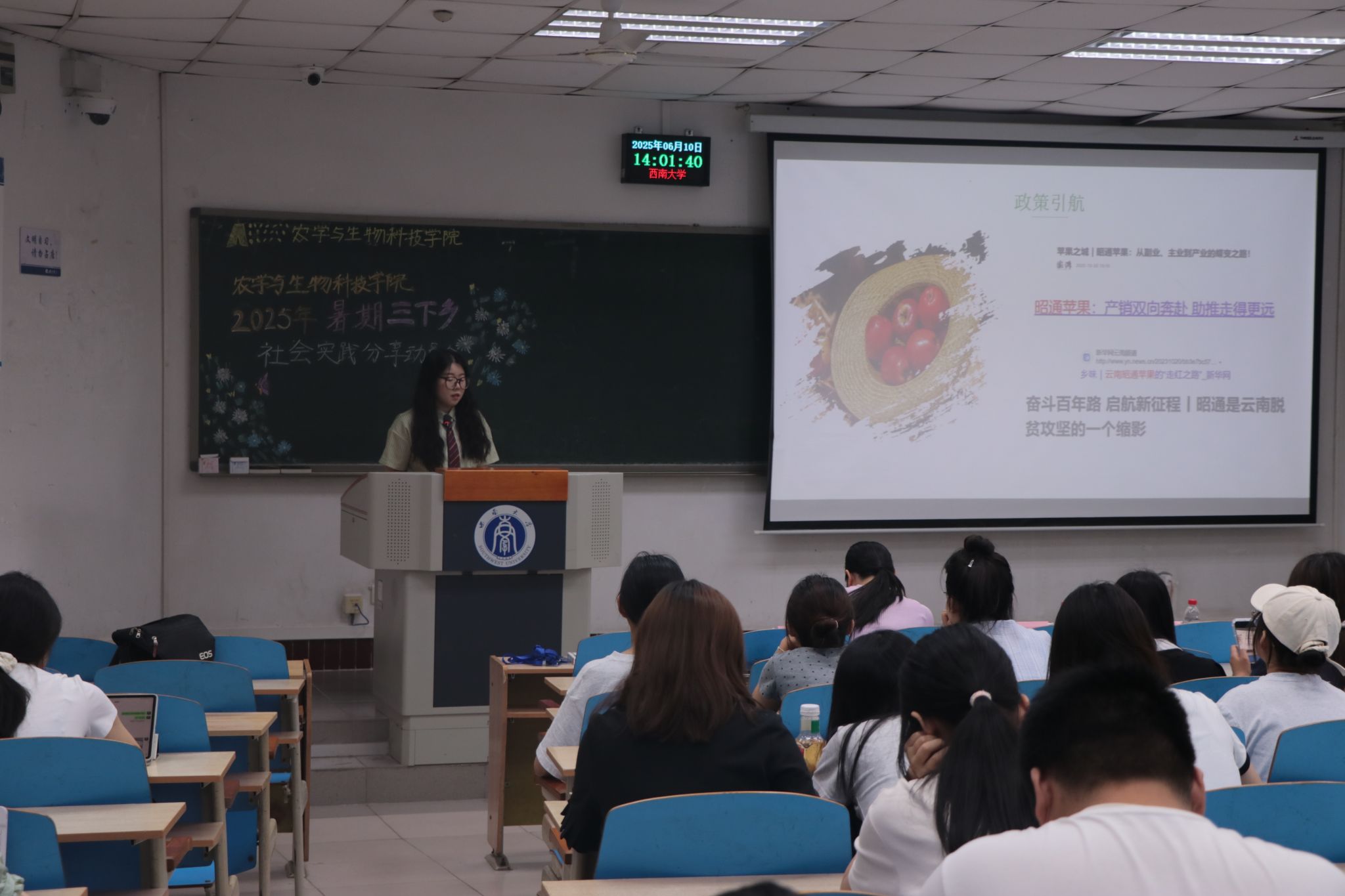 紧接着,周嘉馨同学代表云南昭通苹菌小分队介绍了小队的实践情况。周嘉馨同学表示,小队开展了“中央一号”文件宣讲活动,深入浅出地解释政策要点,通过生动例子和图表让村民易于理解。在与洒渔镇苹果产业主要负责人秦梦访谈中,让小队成员更加了解当地苹果产业的发展历程。在与当地老人的交谈中,队员们聆听了他们对过去几十年农业变化的回忆,深刻感受到乡村振兴战略的实际成效。