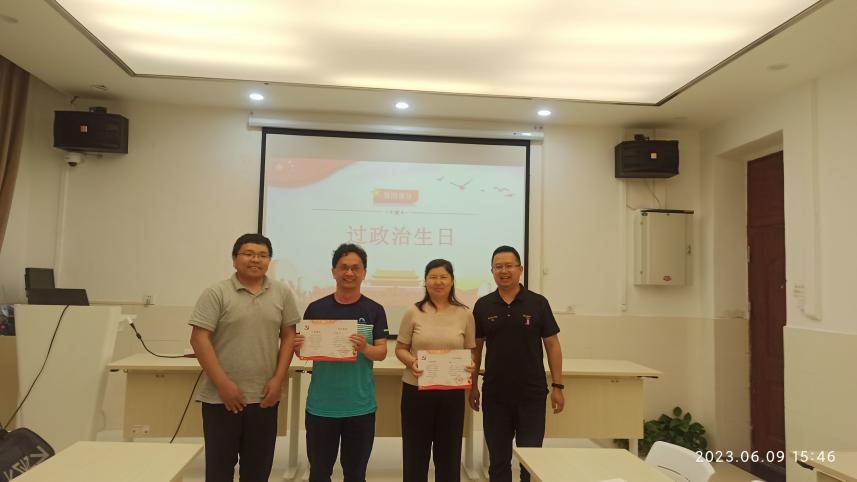 接下来,全体支部党员为崔翠同志、王国强同志过政治生日;支部联系领导郑莉佳同志为毕业生党员赠送纪念品。