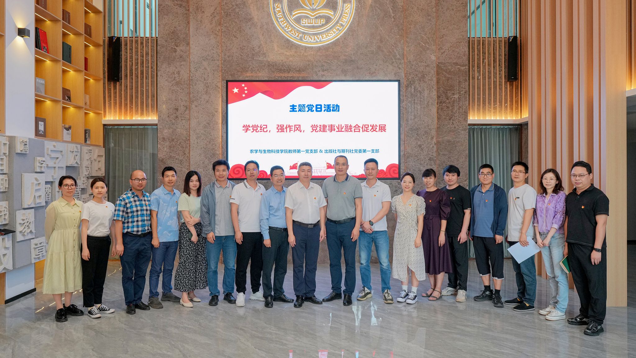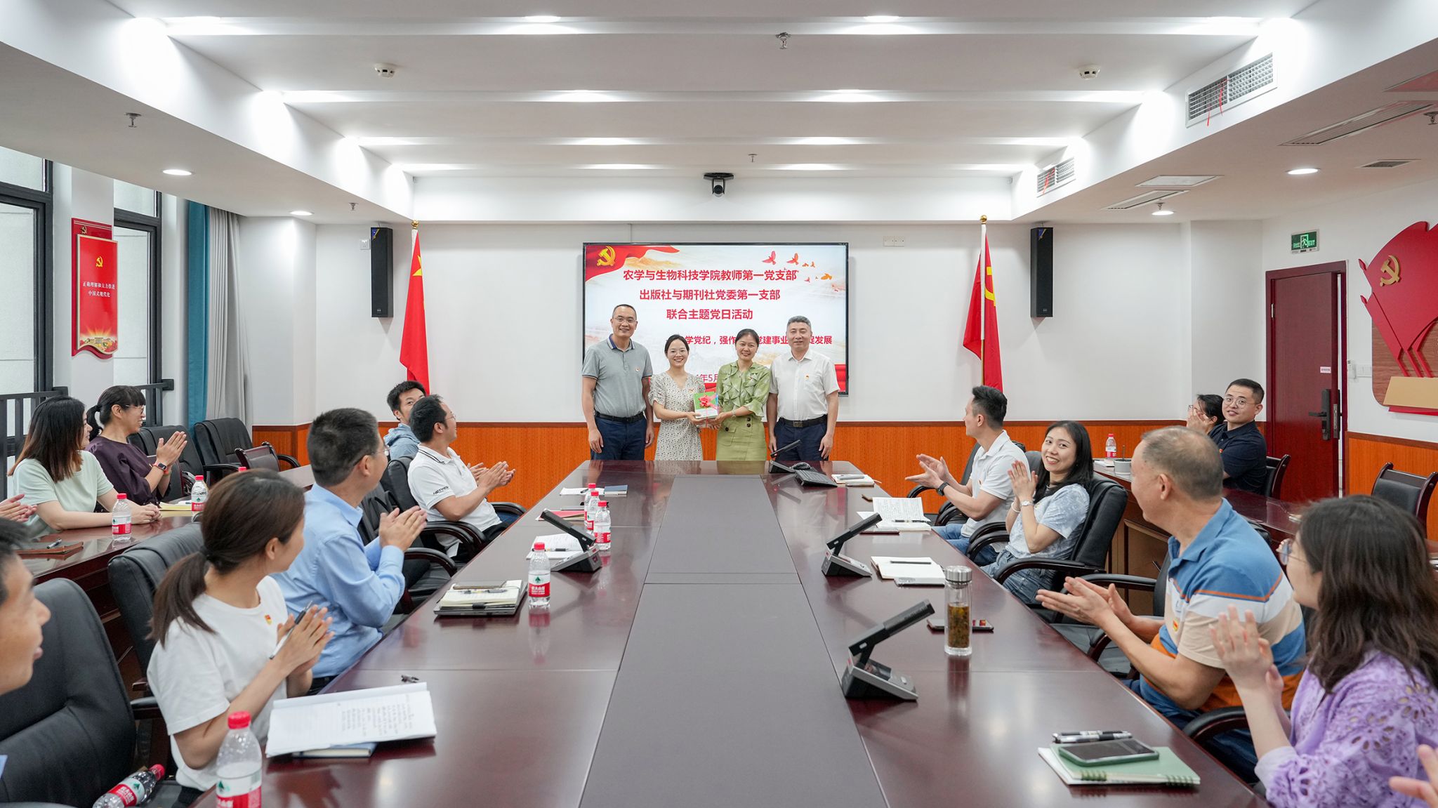 为全面提高党支部建设质量,处理好党建和业务的关系,教师一支部结合新农科发展需求,以及教育部对普通高等教育本科新形态教材的规划需求,于2024年5月17日下午,与出版社与期刊社党委第一支部携手,在出版社2001会议室成功开展了以“学党纪,强作风,党建事业融合促发展”为主题的党日活动。通过深入交流学习,共同推动党建与业务工作的深度融合,同时也促进双方支部党员之间的友谊。