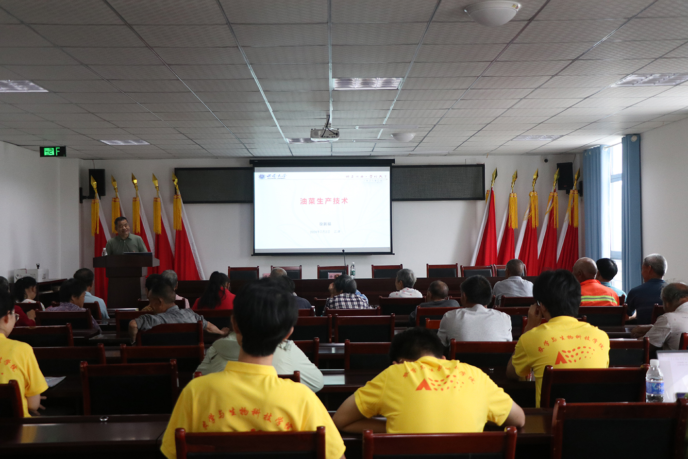 黄庄村作为重庆市江津区现代化农业园区核心示范片区,是一个以传统种植养殖业为主的农业村。近年来,该村探索形成的“油菜+高粱”轮作种植模式,不仅提高了土地的利用率,还可以促进农民增收、生产增效和生态增值。来自实践团的油菜领域专家徐新福老师和高粱领域专家肖前林老师,以其丰富理论知识和实践经验,为农户们带来了一场深入浅出的种植技术讲座。首先,肖前林老师从高粱生产的重要性、高粱的生物学基础、高粱绿色高产栽培技术、高粱生产存在的问题和高粱质量等级区分等五个方面向农户们介绍了高粱种植的关键技术,详细解析了高粱在生长过程中需要注意的事项,并分享了提高高粱产量和品质的实用技巧。随后,徐新福老师针对前一天座谈会中提到的问题详细讲解了油菜宜机化种植的技术要点和品种选择。他强调,实现油菜生产种、管、收的全程机械化的关键在于品种的选择和收获时期的把握。此外,他表示,油菜的科学种植不仅能提高产量,还能改善土壤肥力,减少病虫害的发生。