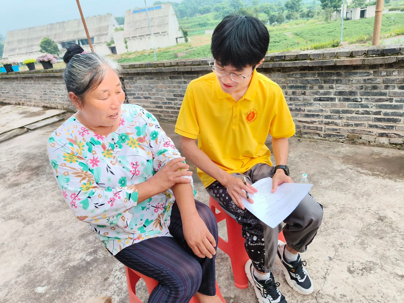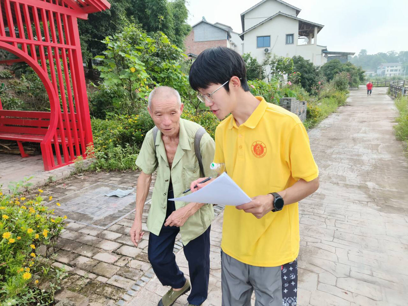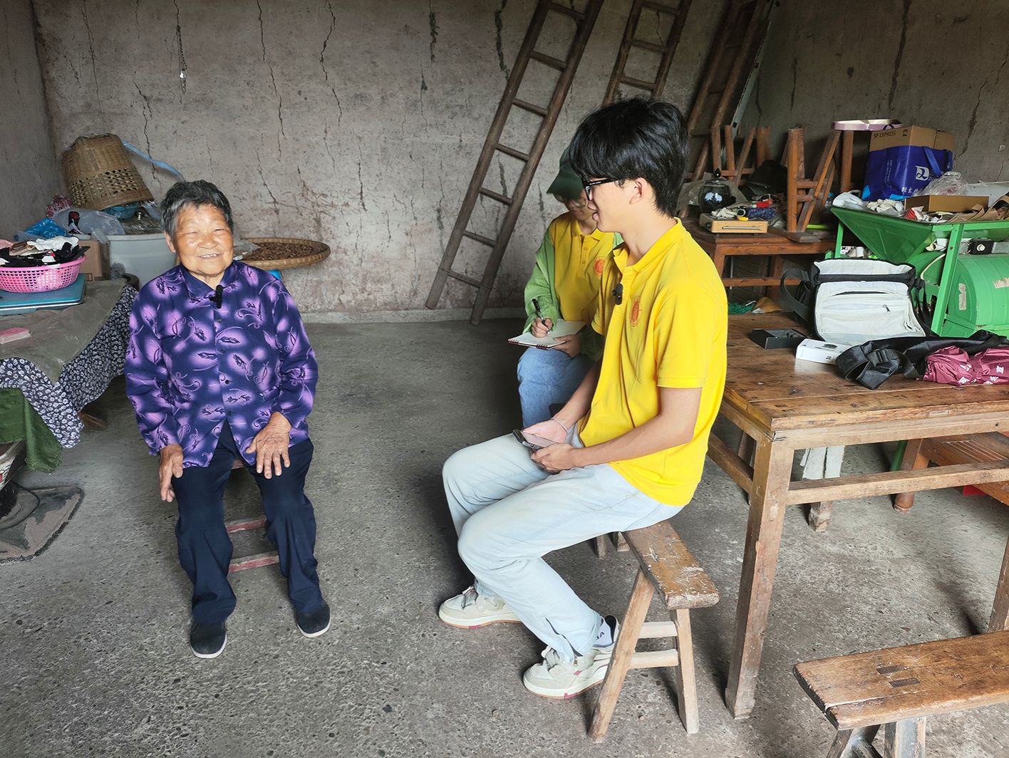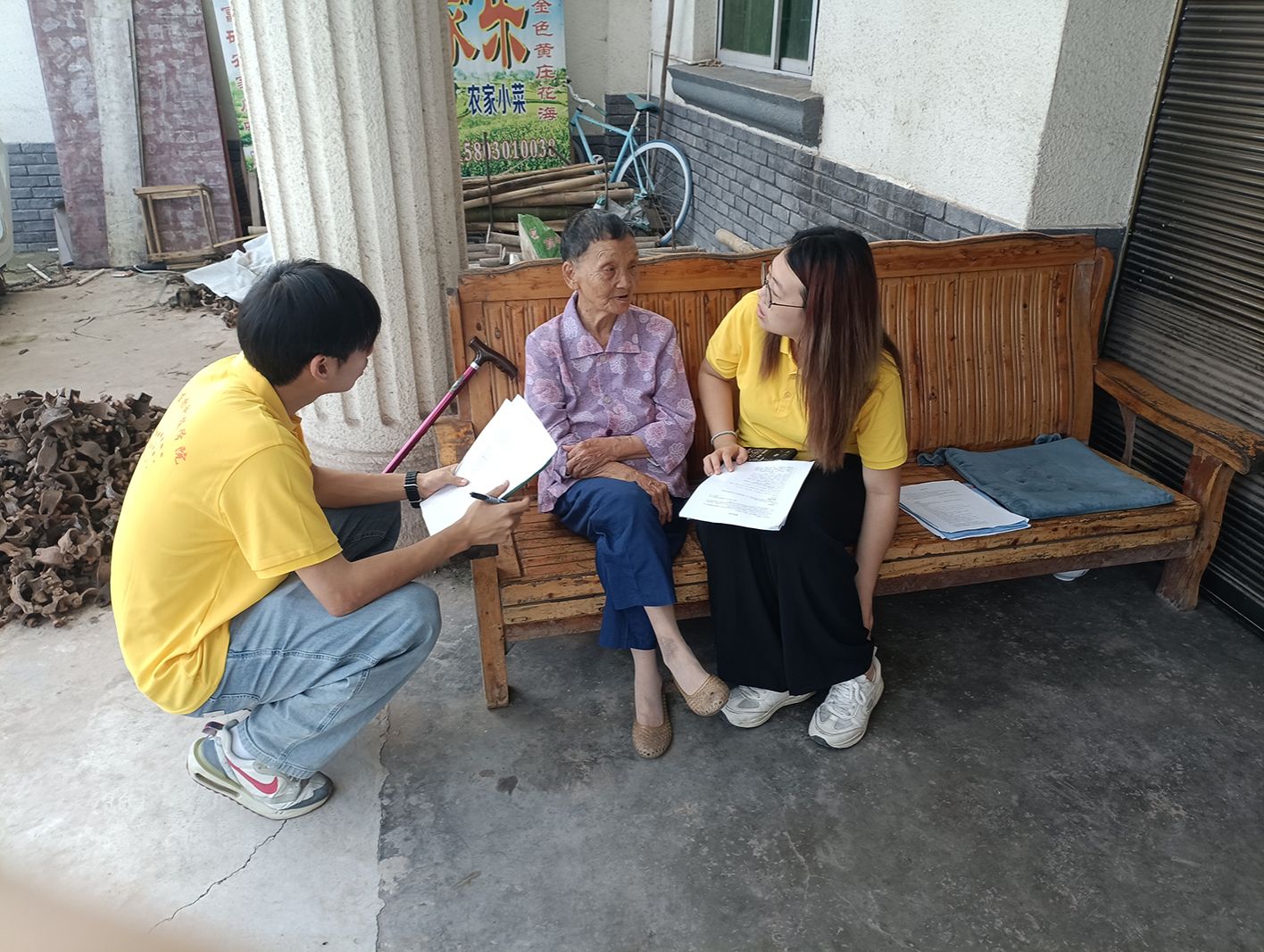 7月4日,实践团在黄庄村走村入户开展乡村振兴专题问卷调查与访谈,全面了解当地在产兴旺、生态宜居、乡风文明、治理有效、生活富裕方面的发展状况。实践队员分为两组,一组深入当地村民家中,与村民亲切交谈,了解他们的农业生产和生活现状,另一组拜访了黄庒村的退休老干部,听他们讲述黄庄村多年来的发展与变迁。