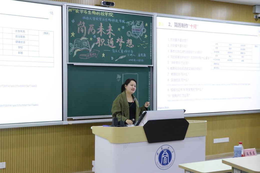 最后,高老师向同学们展示了往届学长学姐的优秀简历实例,详细指导同学们如何在简历中突出个人优势、规避不足,实现高效自我展示。