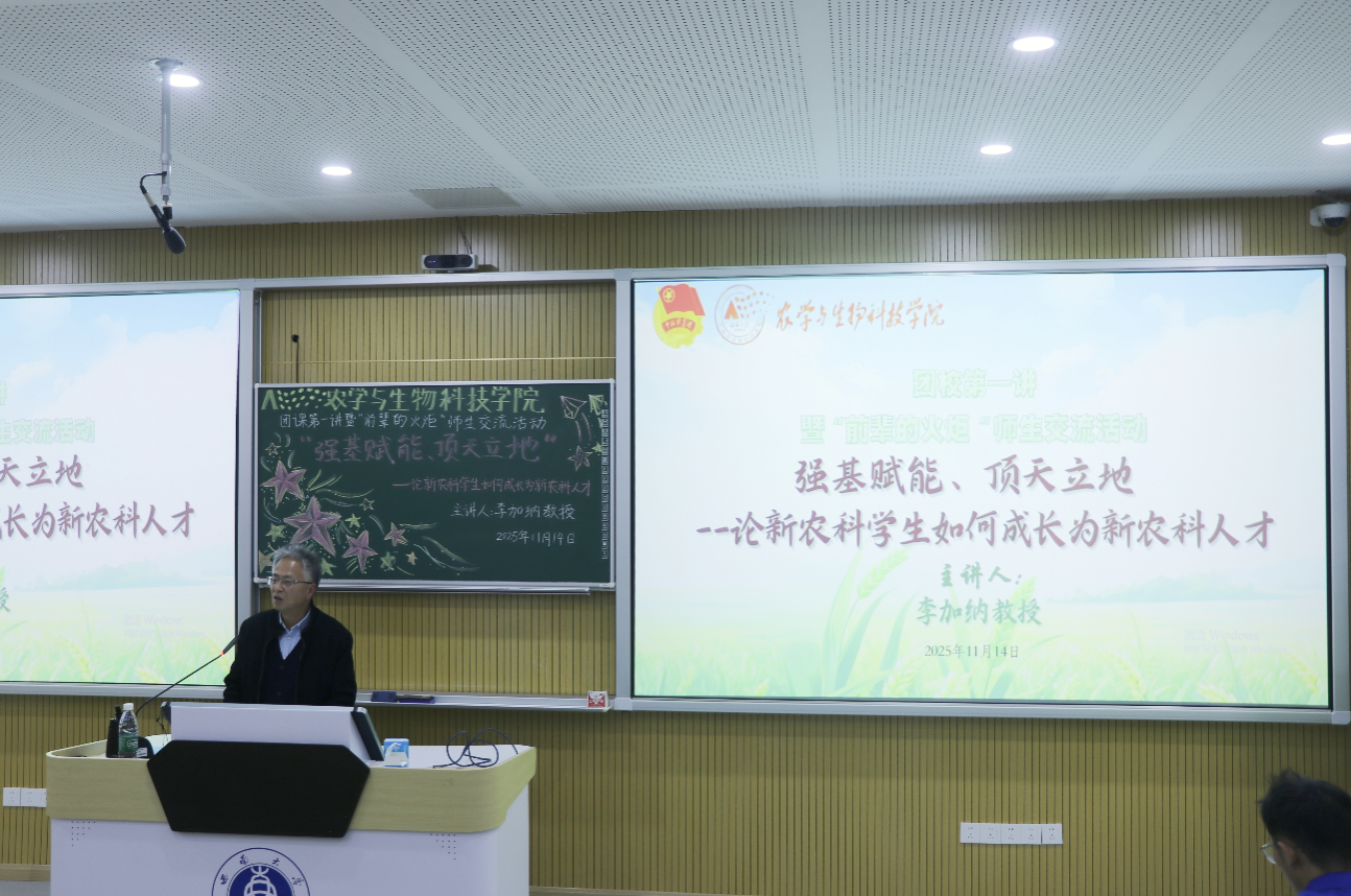 为加强青年员工理想信念教育,强化对专业的理解与认知,助力新农科学子成长成才,2025年11月14日下午,bevictor1946韦德官网在31教209隆重举行了“青马工程”培训班暨第十三期团校培训班第一讲暨“前辈的火炬”师生交流活动,邀请到黄大年式教师团队负责人李加纳教授为学员们授课并开展师生交流。