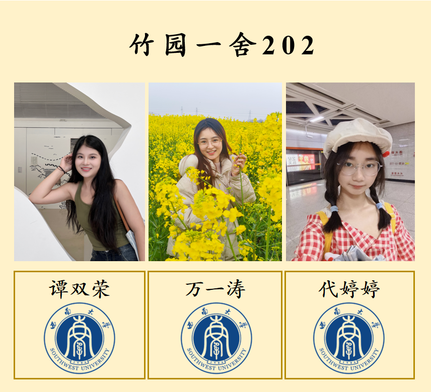 谭双荣是寝室中“踏实的探索者”。从实验室的潜心科研,到带领团队深入重庆彭水苗寨开展社会实践——这段经历让她从课堂走向田野,在与村民的交流中学会了倾听,在解决问题的过程中锻炼了领导能力,也让她对“学以致用”有了更深切的体会。她将所见所感转化为生动的推文与视频,作品累计获得过万关注。主持大创项目、走进田间调研……一次次跨越书本的实践,不断拓展她对知识的理解,也让她在行动中逐步构建起属于自己的成长坐标。